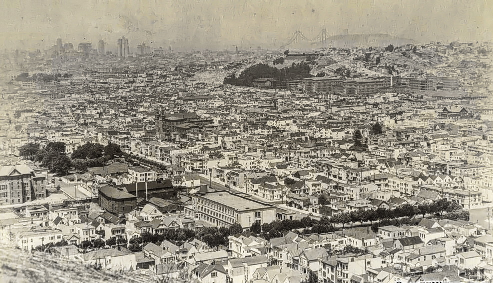 Circa 1936: View north from Bernal Heights. Bay Bridge under construction in the distance. 321 is visible in this photo. .
